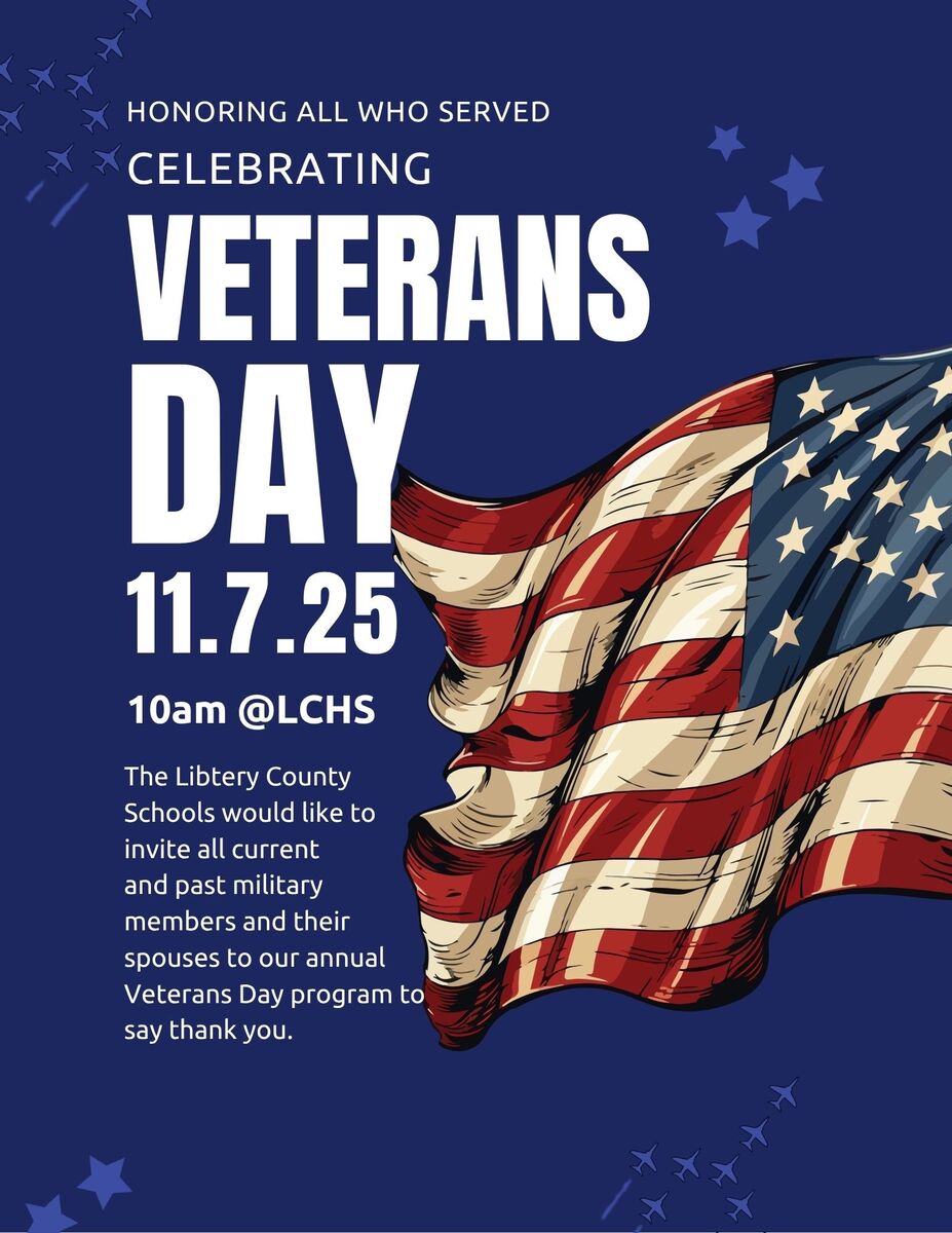 Liberty County will be holding their annual Veterans Day program at LCHS Friday, November 7th at 10:00. Please see attached flyer. If you have a veteran in your family, please make them aware of this . . .